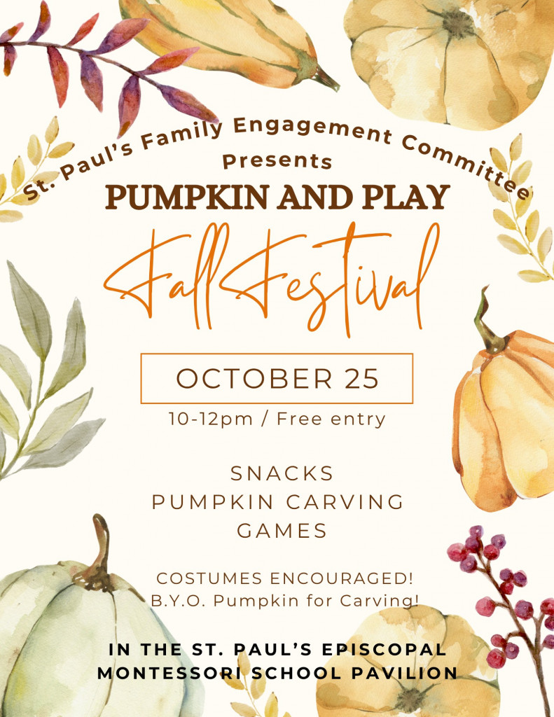 PUMPKIN AND PLAY FALL FESTIVAL – Saturday, Oct 25th, 10am-12pm in the pavilion – Any donations can either be brought to the school office by Friday afternoon or directly to the event on Saturday morning – If we need to cancel due to weather, room reps will reach out to their communities via your group texts/whatsapp. I’ll also send a Brightwheel message. No update means we are good to go! – Costumes are encouraged! – Don’t forget to bring a pumpkin: bring carving tools if you want to carve a pumpkin; there will be paints provided for pumpkin decorating if you choose to go that route. – Bring your own lawn chair if you want a place to sit. There are a few picnic tables around the pavilion but not enough for everyone. – There will be water jugs, but please help us make the event more environmentally friendly by bringing your own refillable water bottle to use. – If you haven’t had a chance to sign up to help, here is the link: https://www.signupgenius.com/go/70A094AAAAB2BA7FD0-58762083-pumpkin#/